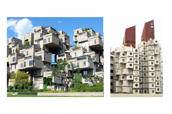 تصویر ۲: از راست به چپ، برج ناکاگین ۱۹۷۰ ، هبیتات ۶۷ ۱۹۶۷ (http://inhabitat.com/)